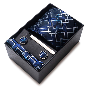 Grosir merek Fashion 7.5 cm dasi saputangan Cufflink Set kotak dasi biru geometris setelan aksesoris untuk pria pas tempat kerja