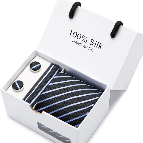 Diskon besar mode 8 cm dasi saputangan Cufflink Set kotak dasi setelan aksesori garis emas pas tempat kerja hadiah ulang tahun