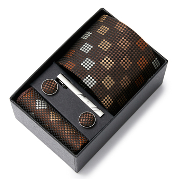 하이 퀄리티 브랜드 7.5 cm 넥타이 포켓 사각형 커프스 단추 세트 넥타이 상자 다크 브라운 격자 무늬 액세서리 맞는 비즈니스 직장에